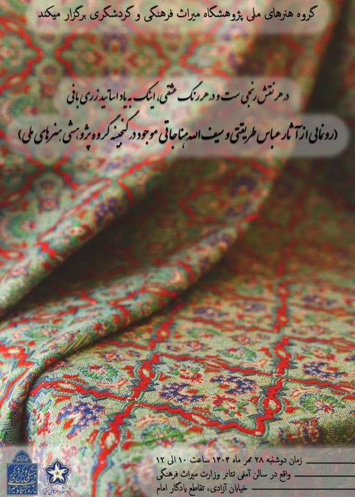 گروه هنرهای ملی پژوهشگاه میراث فرهنگی و گردشگری رونمایی از آثار استاد عباس طریقتی و سیف الله مناجاتی را به عنوان ۲ اثر موجود در گنیجنه گروه پژوهش های هنرهای ملی برگزار میکند.