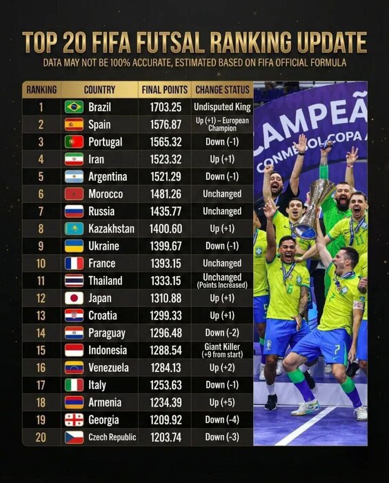 تیم ملی فوتسال کشورمان که در رده‌بندی قبلی در رده پنجم قرار داشت، پس از قهرمانی در آسیا، یک پله صعود کرد.
